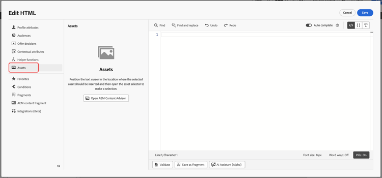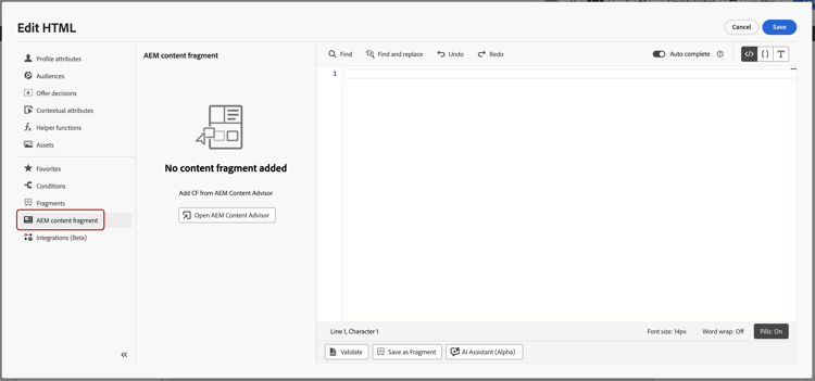 To add an Adobe Experience Manager Content Fragment, click AEM Content Fragment then Open AEM Content Advisor.