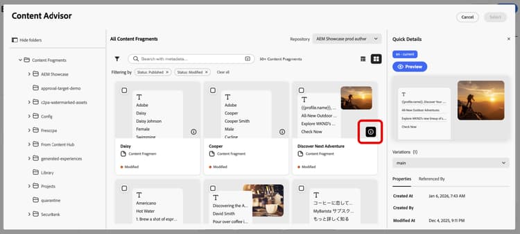 Adobe Experience Manager Content Advisor provides the following Content Fragment features: