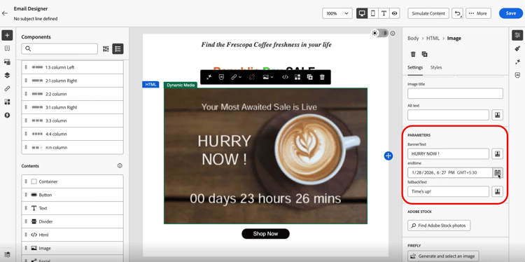 Create urgency and maximize conversions with Dynamic Media countdown timers that update in real-time when recipients open your emails. This feature is ideal for flash sales, limited-time offers, and time-sensitive promotions.