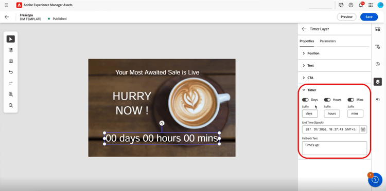 For more information on how to add countdown timers to your Dynamic Media template in Adobe Experience Manager, refer to this document.