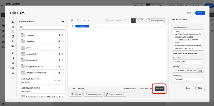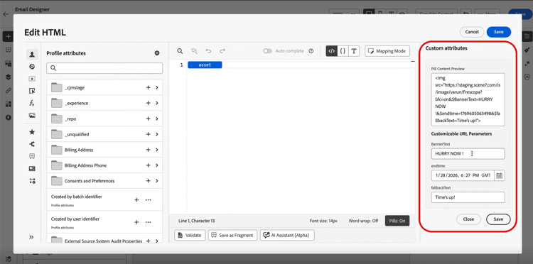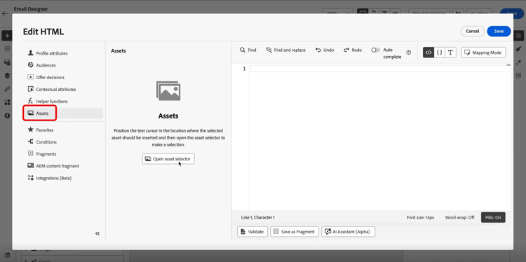 From the Edit HTML menu, navigate to Assets and click Open asset selector to browse and select your published Dynamic Media template.