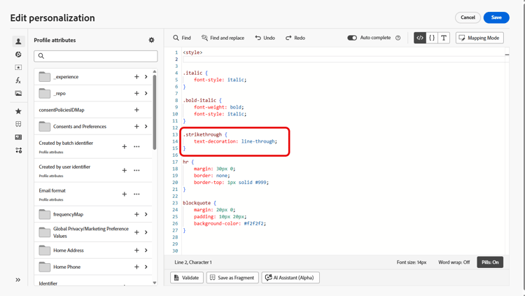 In the personalization editor that opens, update the styling and/or content as wanted by adding or removing elements of the editable field.