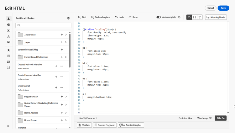 With customizable fragments, specific fields within a fragment can be defined as editable when the fragment is added to a campaign or journey action. For example, suppose you have a fragment with a banner, some text, and a button. You can designate certain fields, such as the image or button target URL, as editable. This allows users to modify these elements when they incorporate the fragment into their campaign or journey, providing a tailored experience without affecting the original fragment.
