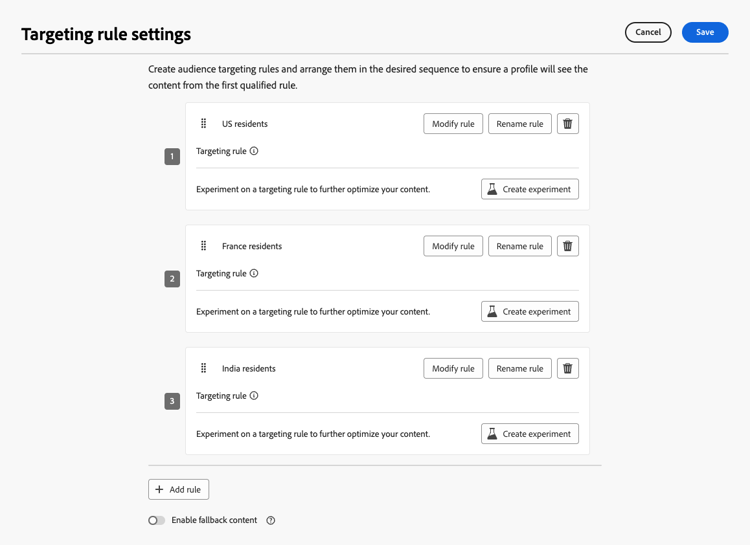 Create a journey or a campaign where you define several targeting rules. Learn how