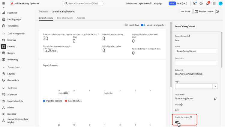 In the dataset management user interface, use the toggle to enable the dataset for lookup.