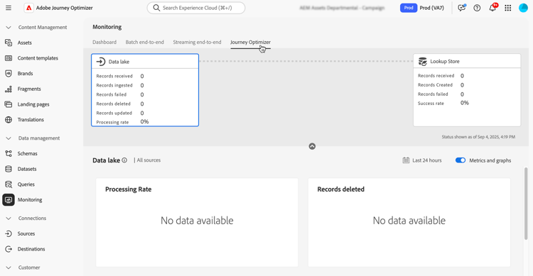 Once a dataset has been enabled for lookup, you can review the status of ingestion into the lookup service by going to the Monitoring menu and selecting the Journey Optimizer tab.