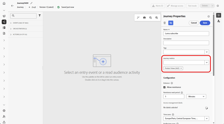 Edit the journey’s configuration pane to define the name of the journey and set its properties. Learn how to set your journey’s properties on this page.