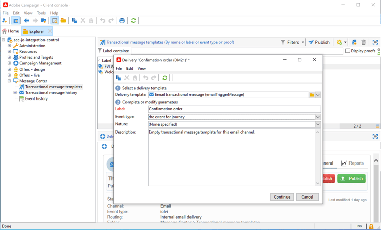 First, create a transactional email template in Campaign. Then, in Journey Optimizer, create the event, action, and design the journey.