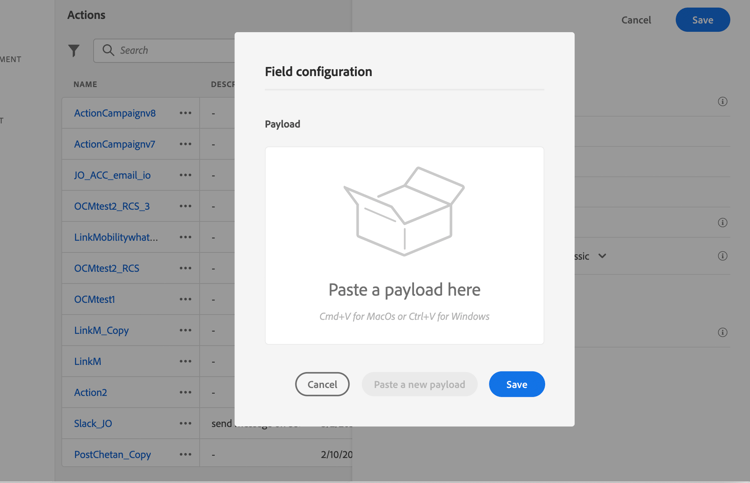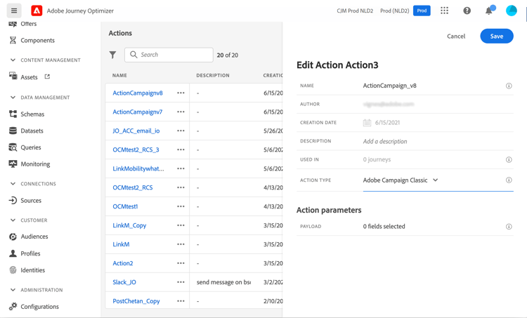 Create an action in Journey Optimizer corresponding to your Campaign template. In the Action type drop-down, select Adobe Campaign Classic.