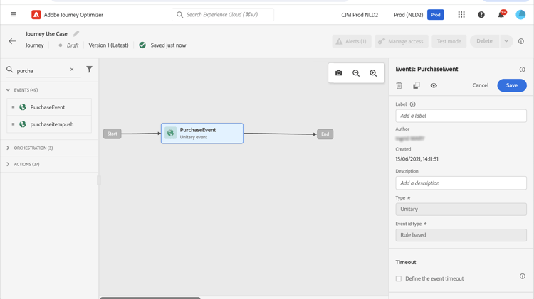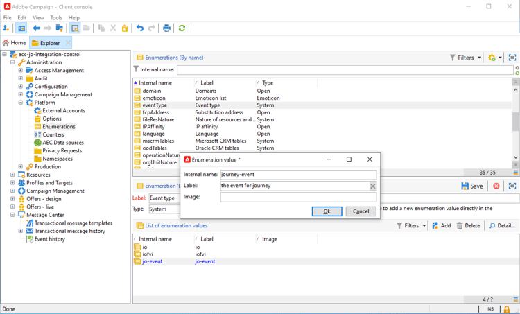 Under Administration > Platform > Enumerations, select the Event type (eventType) enumeration. Create a new event type (“journey-event”, in our example). Use the internal name of the event type when writing the JSON file later.
