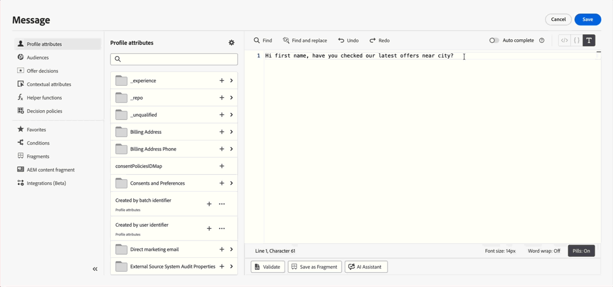 Adobe Journey Optimizer now includes an AI Assistant in the Personalization Editor. Describe what you want to personalize in plain language and the assistant produces a personalization expression you can use as-is or refine in a short follow-up conversation.