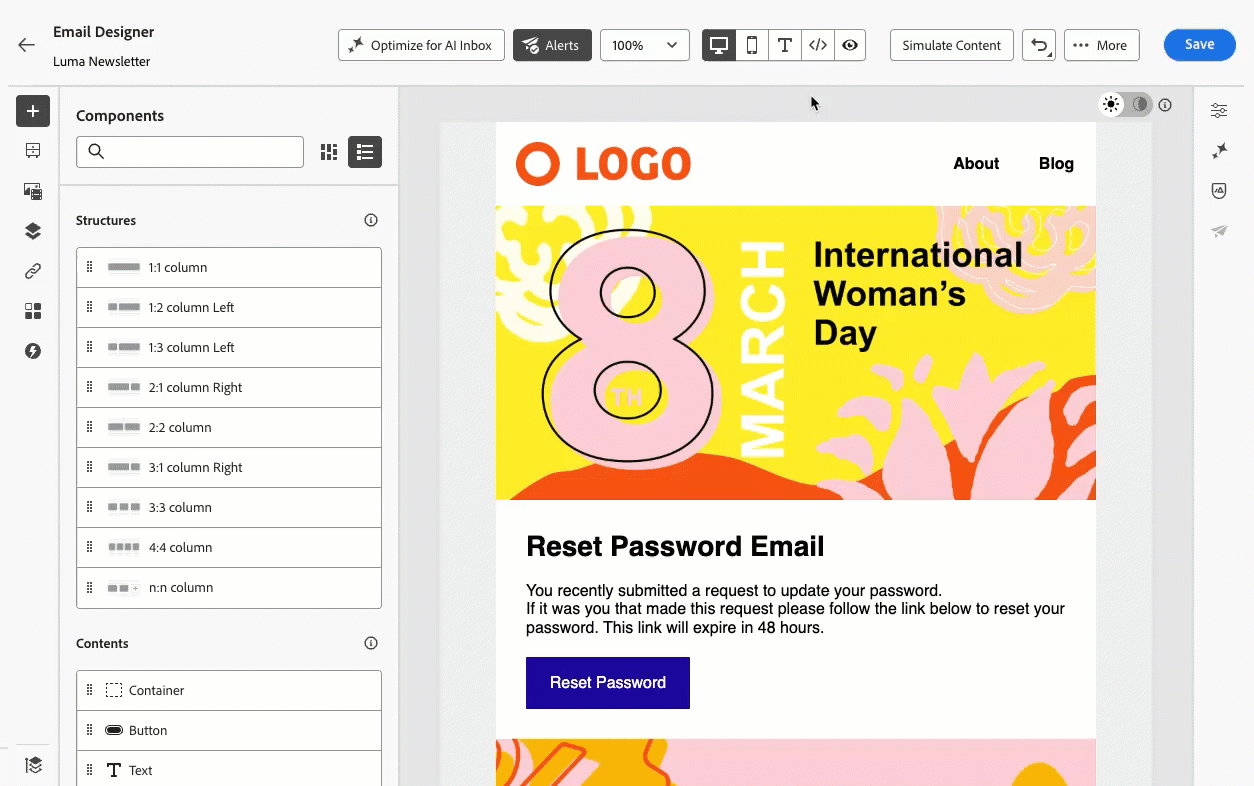 Previously available for email content templates only, this capability is now deployed to email content in the Email Designer (for example, emails authored in journeys and campaigns), in addition to email content templates. It is currently in Limited Availability — contact your Adobe representative to gain access. Read more