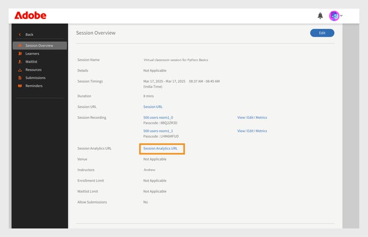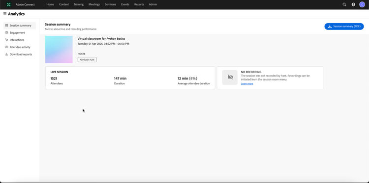 Instructors can access Session Analytics for their completed Adobe Connect sessions via a new link provided in their session dashboard.
