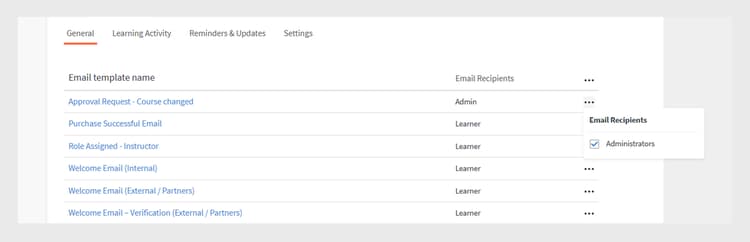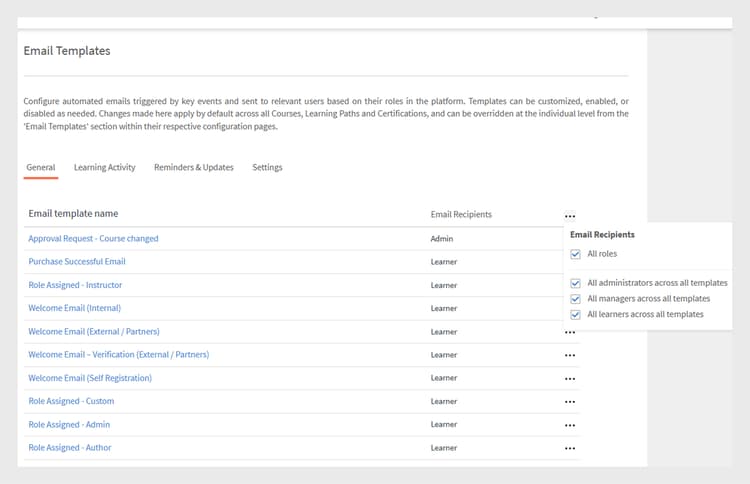 To access the templates, click Email Templates on the left pane. On this page you can see three different categories of templates, General, Learning Activity, and Reminders and Updates. There is a fourth tab, Settings, where you can configure the templates.