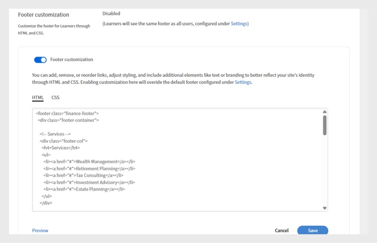 Footer customization settings in Adobe Learning Manager, showing the toggle to enable custom footer and fields to add HTML or CSS for personalized branding -