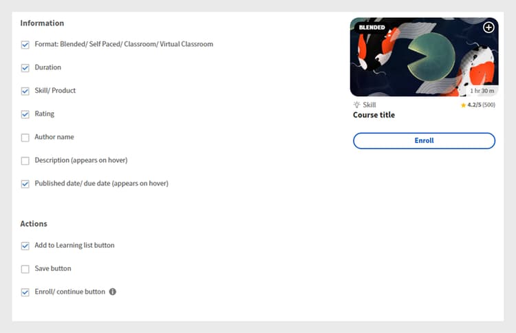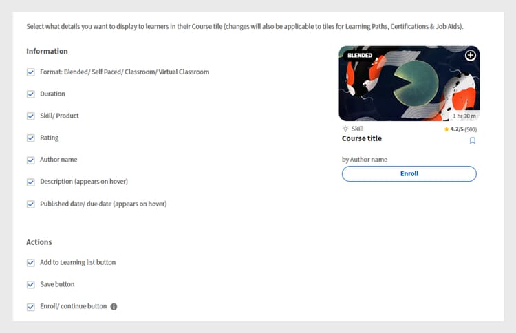 Course tile configuration screen in Adobe Learning Manager, where administrators select the information and actions to display for learners -