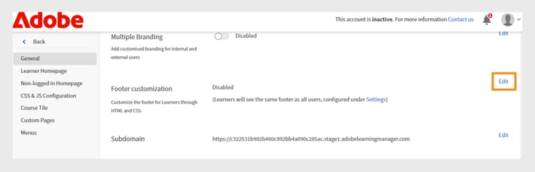General settings screen in Adobe Learning Manager, showing options to enable customization of the footer -