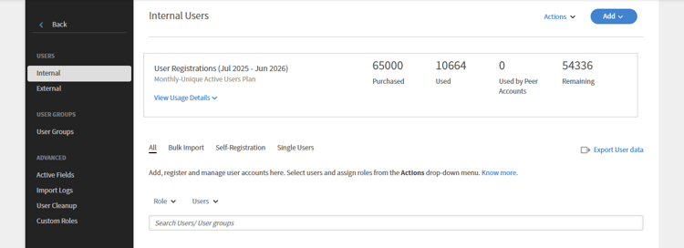 The Administrator can view the user report of the peer account. The parent account admin can request to access the report and once the peer account admin accepts this, the parent admin will be able to view the number of registered users in the peer account and will be able to download the user report for peer account.