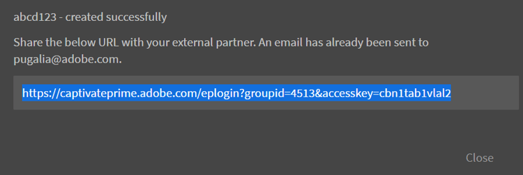 A pop-up dialog box with the URL is displayed. You can copy this URL and send it to the external users. By default, an email with this URL is sent to the user.