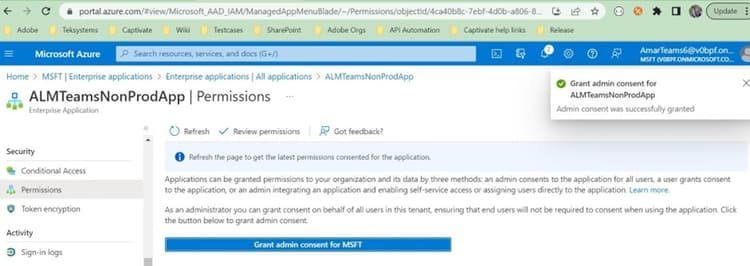 In the Permissions tab, select ’ Grant admin consent for MSFT’ to give ALM teams app permissions.