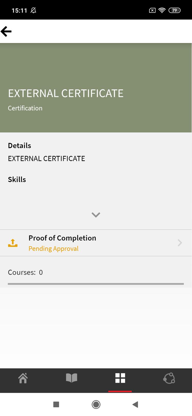 Tap the icon next to the book icon at the bottom of the screen. You can immediately view the catalog with all the associated learning objects. You can choose to view them in grid layout or choose the detailed view. Select recommendations to see course recommendations based on your learning history.