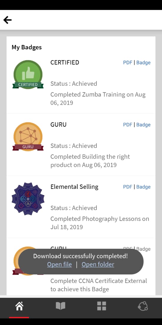Learners can download their badges in PDF and Image format. In the User profile section, scroll down, and click any link to download a badge. The downloaded badge is saved in the default device folder. The app allows you to open the folder or the file immediately after the download completes.