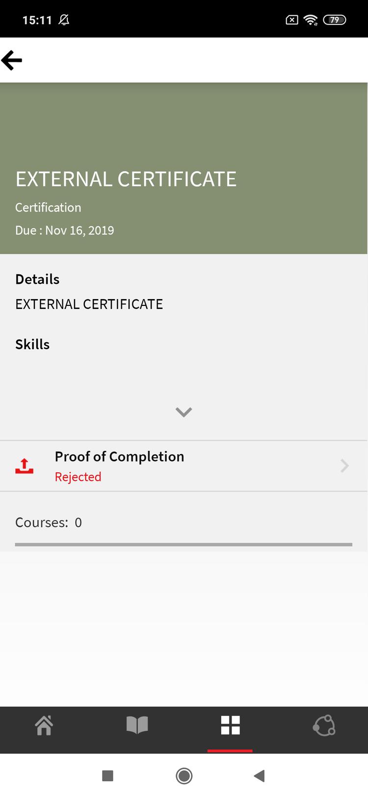 When the instructor rejects the submission, the status on the Learner mobile app changes to Rejected.