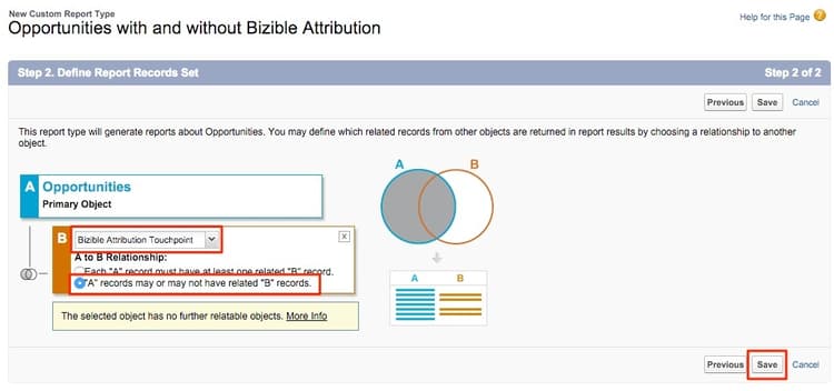 From there, you will link the Contacts Object to the Buyer Touchpoints Object. Ensure that you choose the button “Each “A” record must have at least one related “B” record.”