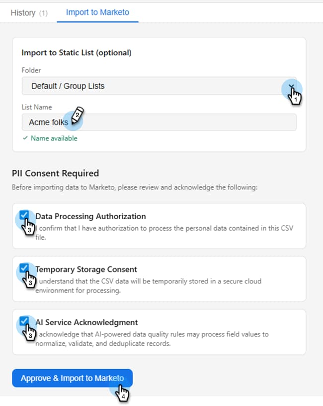 Select the destination folder and enter a name. Check each consent box and click Approve & Import to Marketo.