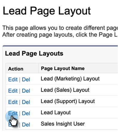 In the left nav, under Build, expand (but don’t click on) Customize, then Leads. Then, select Page Layouts.