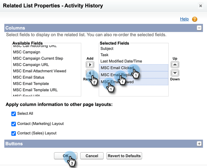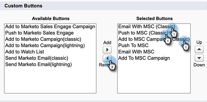 Select Add to MSC Campaign (Classic), Email with MSC (Classic), and Push to MSC (Classic), and click the Remove arrow. Then click Save.