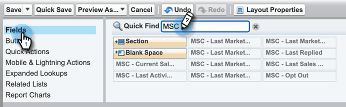 In the console, select Fields. In Quick Find, search “MSC.” All the grayed out fields have been added to your page layout. You’ll have to delete them.