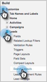 In the left nav, under Build, expand (but don’t click on) Customize, then Leads. Then, select Search Layouts.