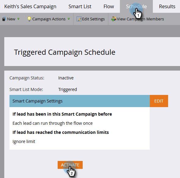 Click the Schedule tab and Activate the campaign.