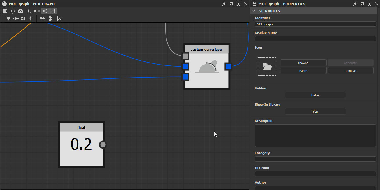 Hidden: When set to True, the parameter in not visible in the graph inputs and MDL material properties