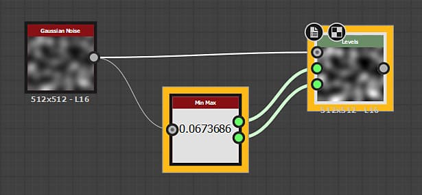 Min Max finds the brightest and darkest values of a Grayscale input and returns them as Values. It’s intended as a more granular, manual alternative for Auto Levels, where you expose the Value Inputs of a Levelsnode and plug the values from Min Max into it.