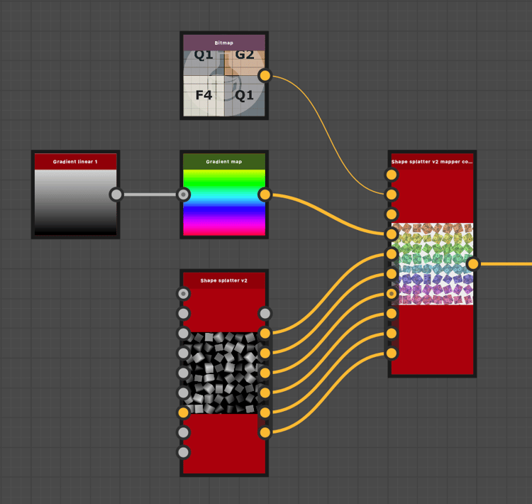 If sampling the ‘Shape splatter v2 mapper color’ node’s inputs is needed, these Sample color node input slots may be used: