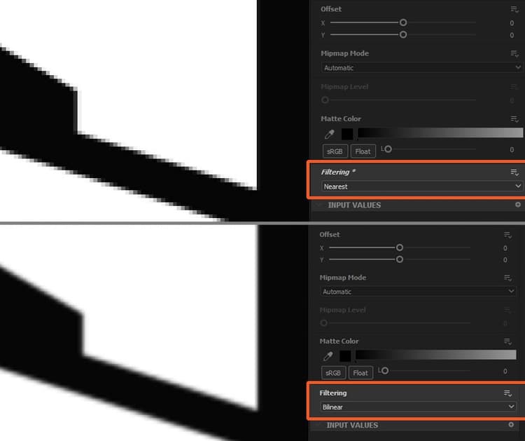 - Bilinear filtering: A filtering process is applied to the source image so its pixels are mapped to the target resolution in a way that smooths out the transitions between pixels. The output is smoother and will look slightly blurred.