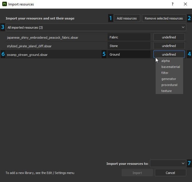 4 - Usage : There are several different usage types available. The list of usages proposed may change according to the file format you are importing. Usage may be preselected for your file if your file format only has one usage type (for example, Painter presets .sppr will automatically be defined as such) OR if it’s been pre-defined in the original Designer graph by its creator.