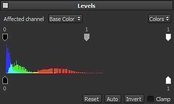 - The Clamp option at the bottom right allows you to clamp the values of the levels between 0 and 1 (0-255). This option should always be checked when working on non HDR channels (like the Base Color).