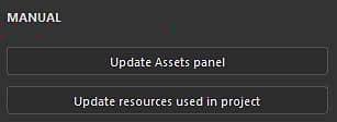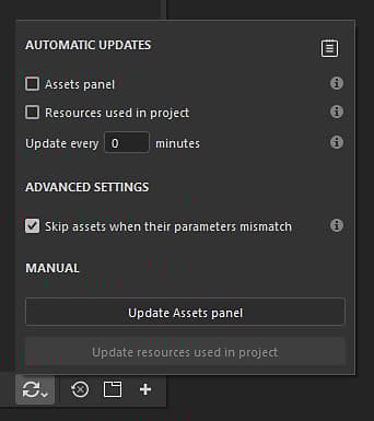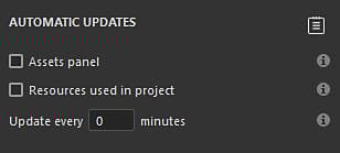 The automatic resource update, or auto-update, is a feature of the Assets window that allows to reload and updates resources when new versions are available. This process can be triggered automatically or manually in the interface, or via Python scripting.