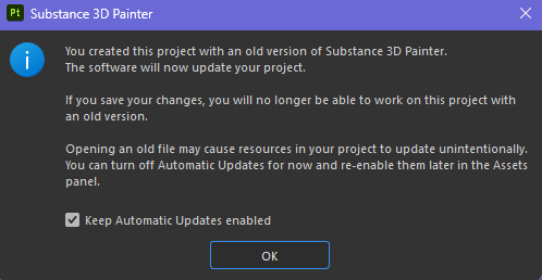When opening an old project, an option will be available inside the popup message warning to inform about the auto-update process. This is a convenient way to quickly disable the auto-update process in case it stayed enabled before opening the old project.