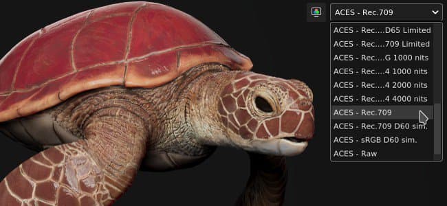 Both the 2D and 3D views are color managed and have a dedicated settings available at the top of the viewport to control which display transform to use:
