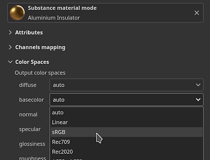 It may be necessary to specify an alternate color space for a resource to differ from the defaults. This can be done via the color space menu.