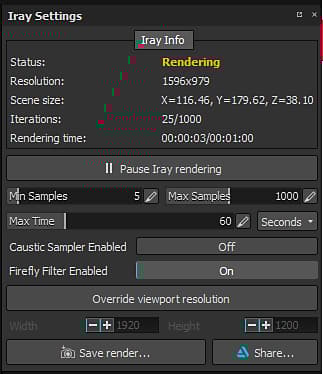 The Iray settings control the rendering of the IRay viewport, how long it will run and the quality of it.
