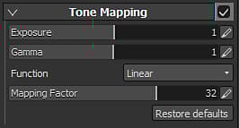 The Tone Mapping parameters allow to control how the colors will be scaled to be displayed on the screen. Those settings can be useful to redistribute colors because of their wide range of values (which can exceed what the current screen is capable of displaying).