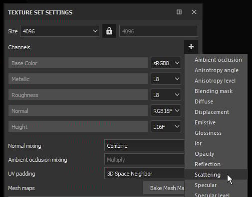 In the Texture Set add a Scattering channel if not already present :