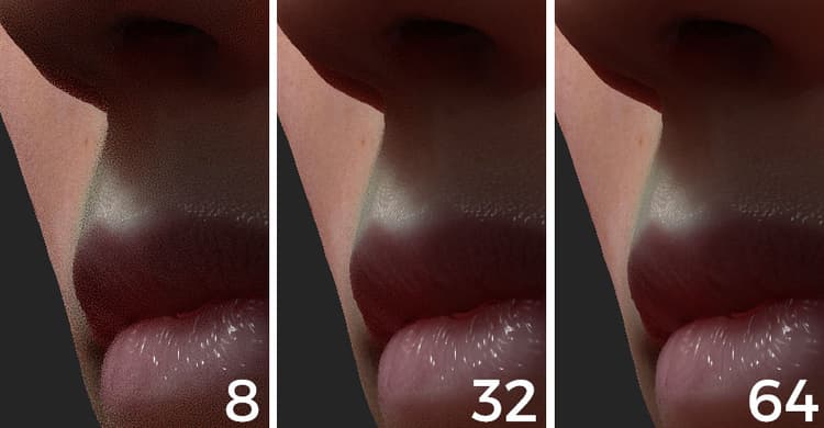 Controls the amount of samples that will be performed to generate the Subsurface blur in screen-space. More samples means less noise but will impact performances.Comparison between 8, 32 and 64 samples when looking close to a surface :