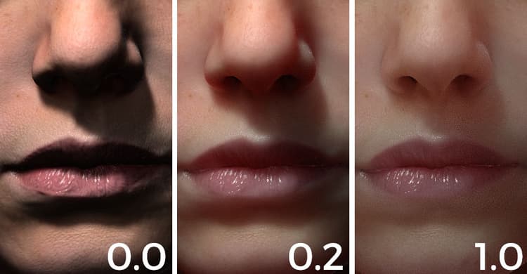 - Red Shift/Rayleigh: more accurate than the skin setting to simulate human or creature surface skin.