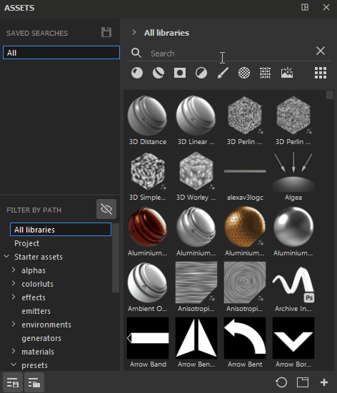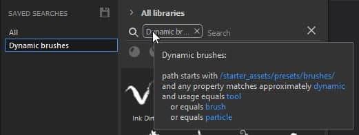 To create a saved search, it is possible to combine different types of navigation - you can type a written query in the search field, select the desired asset type (or several asset types) and a location either via Filter by path or Breadcrumbs. All these can be saved as single saved search, or they can be broken down into separate saved searches. For example, you may want to create a saved search for for brushes that use Dynamic stokes as it’s something you use quite often.
